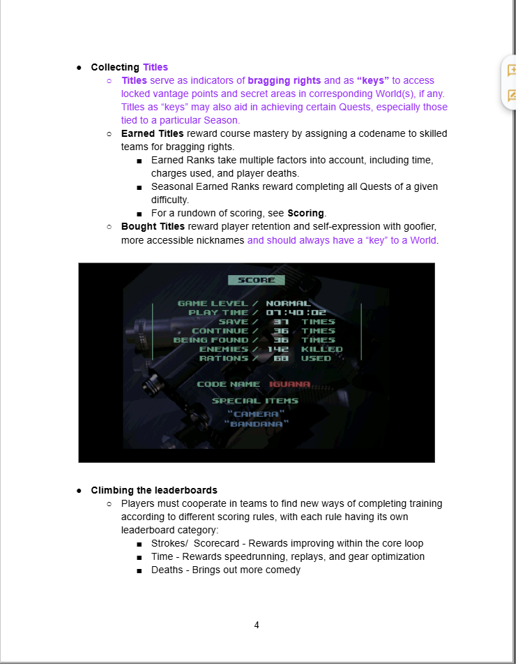 Documented + implemented rewards store and content, including titles and weapons earned through soft currency and quest completion. Created a content cadence for further weapons, cosmetics, and titles throughout operation.
